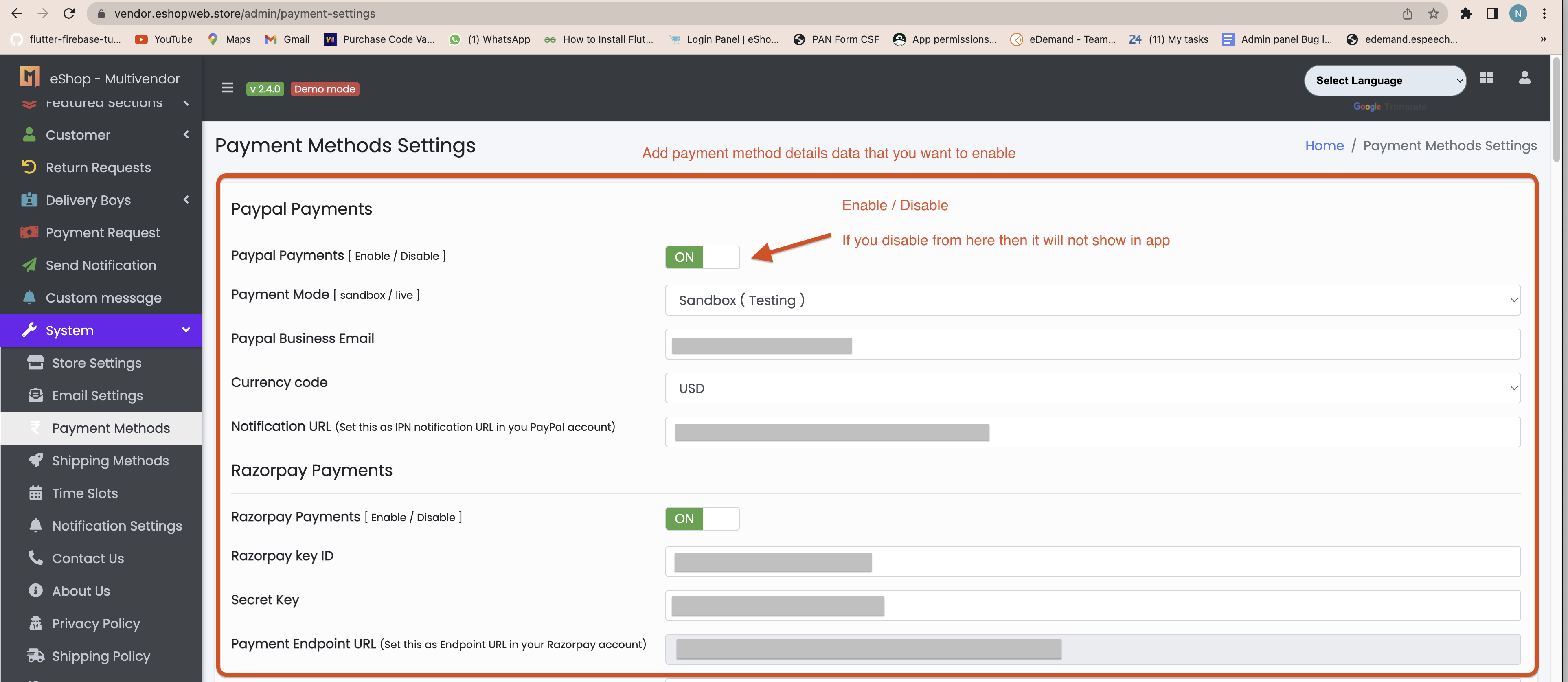 1. go to the panel, in that system > payment mehod. for any payment method you have to add just key id and secrect key.and if you don't wanat to use then disable from here.